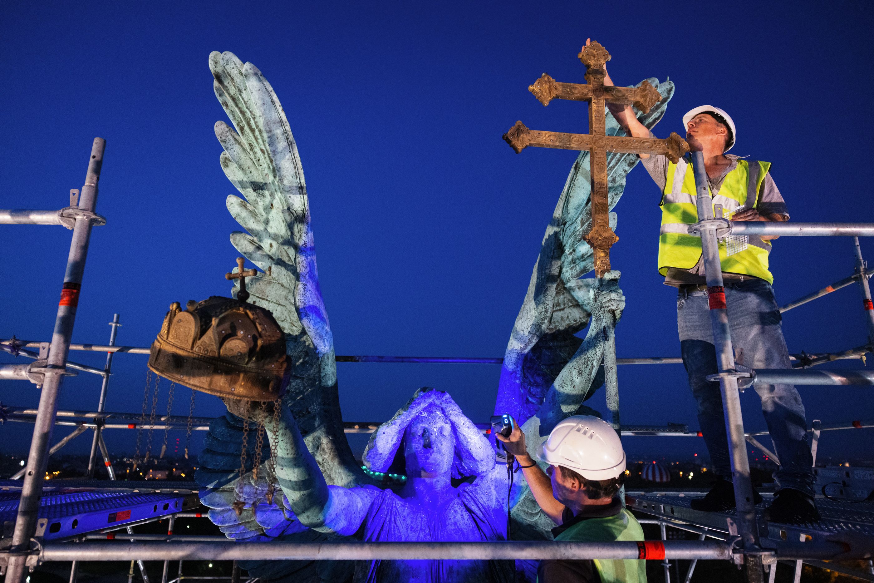 A restaurálás váratlan meglepetést is tartogatott: a szobor beton gömb talapzatának feltárása közben egy összetört üvegedényt találtak – benne egy feltekert papírdokumentummal és nyolc fém pénzérmével. Az időkapszula feltehetően az emlékmű 1901-es avatásának idején került a talapzatba. A papír nedves, erősen szennyezett állapotban, felületén üvegszilánkokkal és betonszemcsékkel került elő. A Magyar Nemzeti Levéltár restaurátorai kontrollált, magas páratartalmú környezetben, milliméterenként bontották ki a tekercset – a kiterített dokumentum végső mérete 18,5 × 37,2 cm lett. Szabad szemmel azonban semmilyen írásnyom nem volt látható rajta.